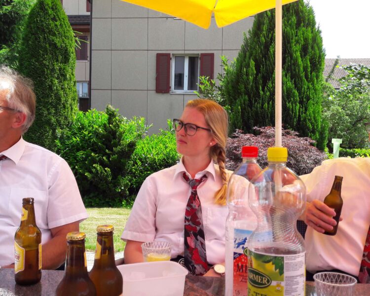 Heute dürfen wir bei schönstem Wetter zum Einzug aufspielen. Danach sitzen wir bei Seri und Hanni unter dem Sonnenschirm und erfrischen uns mit kühlen Getränken. Plötzlich ziehen jedoch Wolken auf und nachdem wir einige vereinzelte Regentropfen gespürt haben, zügeln wir unser Schlagzeug sicherheitshalber unter den Unterstand beim Vikariatshaus. Das Wetter meint es jedoch gut mit uns und so dürfen wir unser Ständli glücklicherweise ohne Regen zum Besten geben.